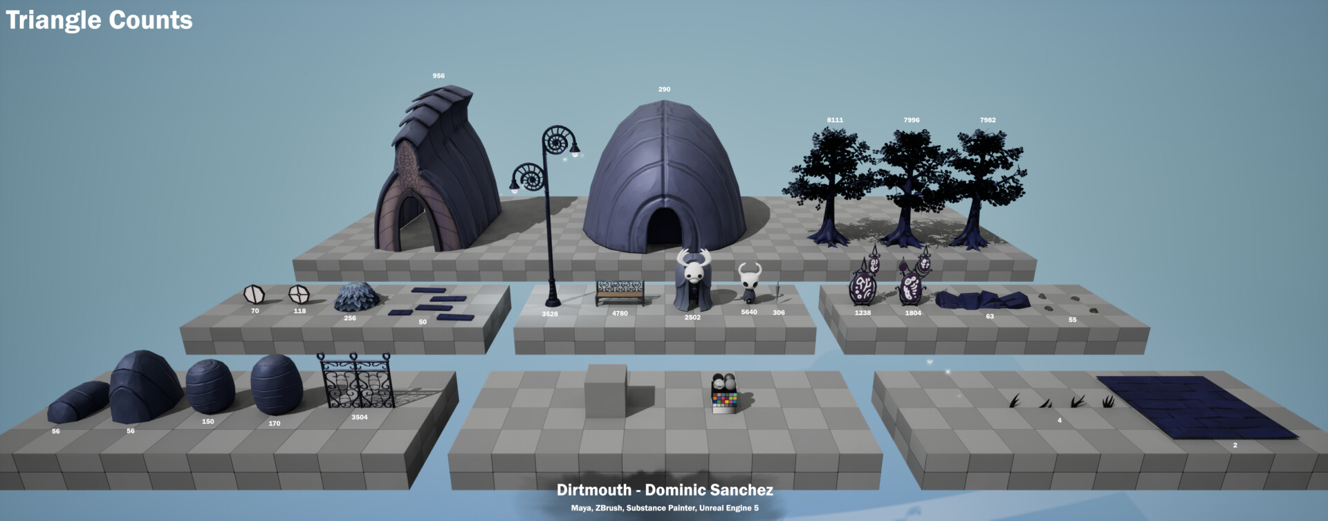 This was created for my Environment Production class. All textures 1k or less with most of them being 512x512 - 256x256. Models Created / Sculpted in Maya / ZBrush. Textured in Substance Painter / Photoshop. Rendered in Unreal Engine 5.
