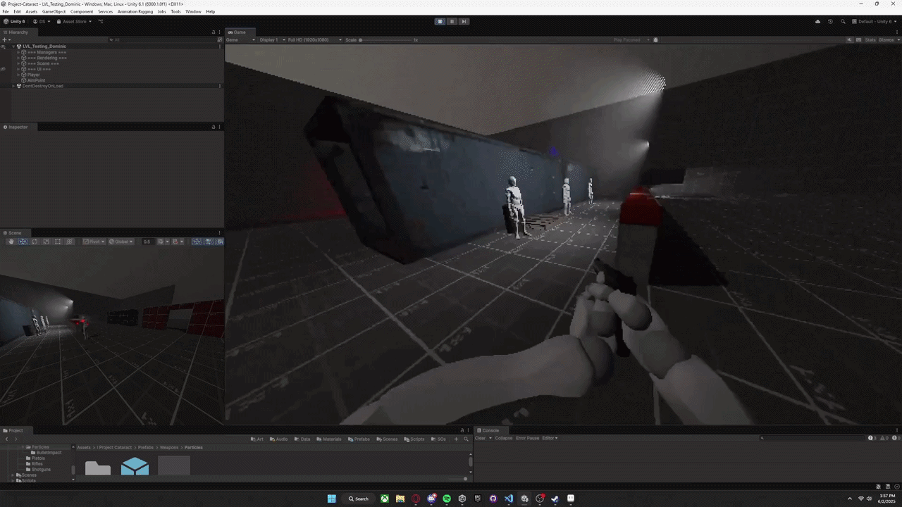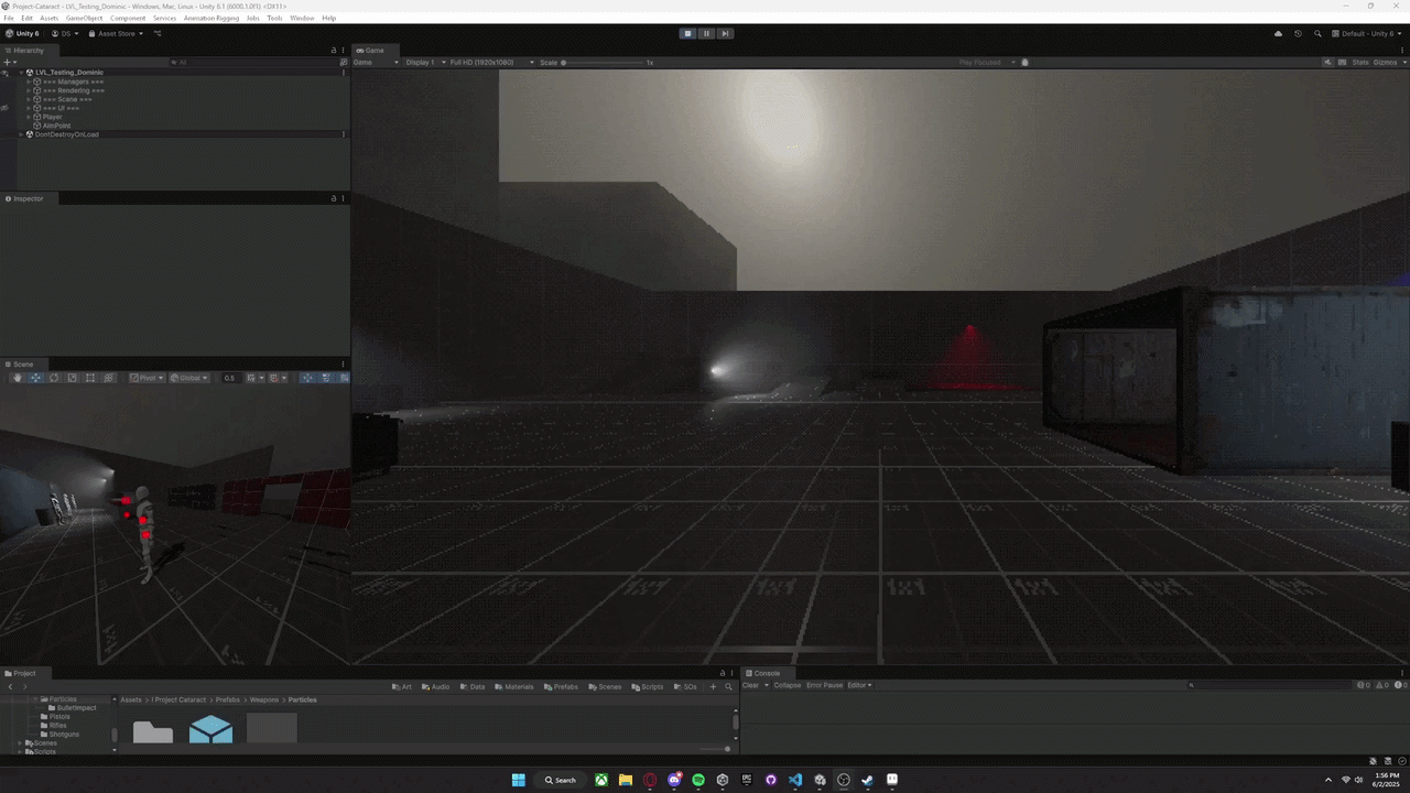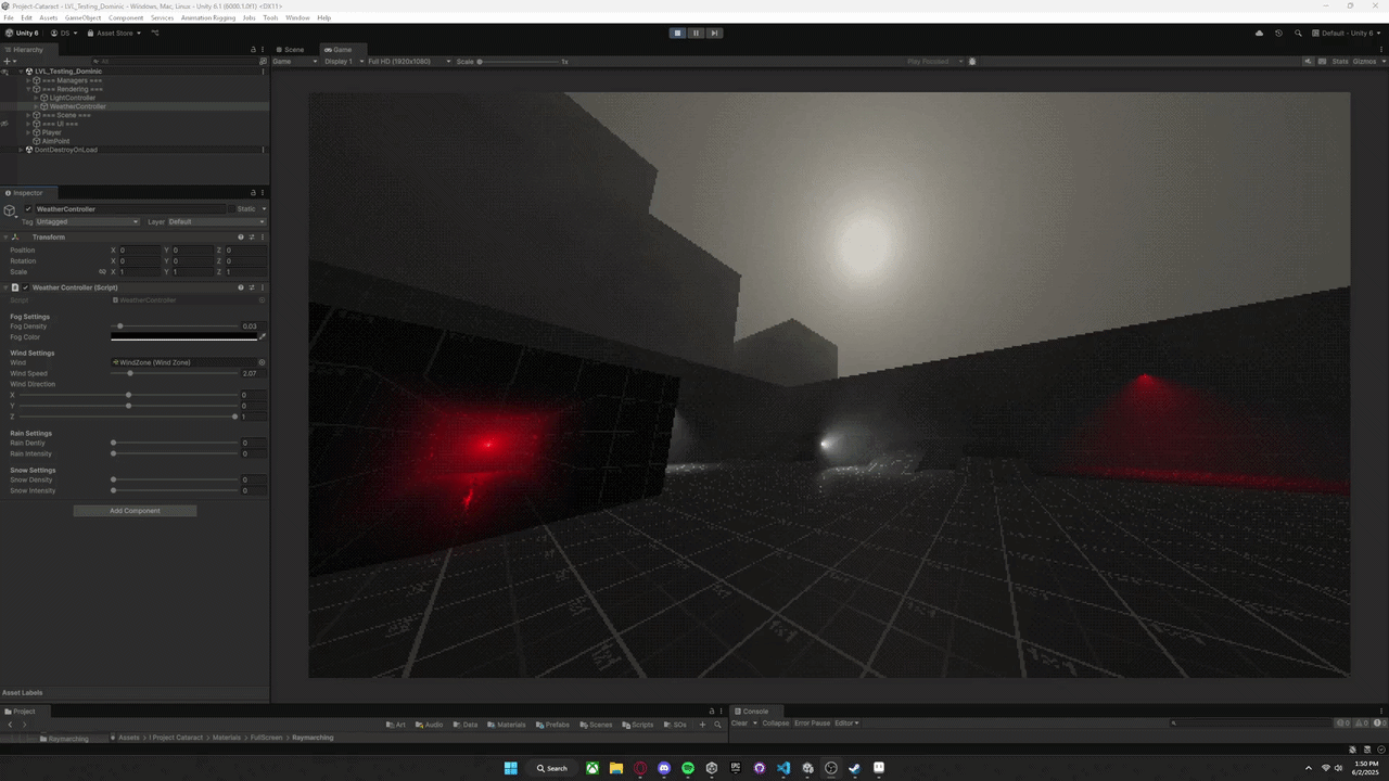 I built a procedural animation system using Unity's Animation Rigging Package, primarily for aiming weapons. It allows characters to dynamically target objects in world space without needing additional animations. The IK targets can be layered or blended with traditional animation and can be used for all humanoid characters in the game. The weather system drives fog color, density, and all particle effects like rain. These changes are global and update all relevant shaders and particle systems automatically. This takes advantage of Unity's built in wind system and Global Shader Variables so there's very little setup we need to do on our end when we use it.