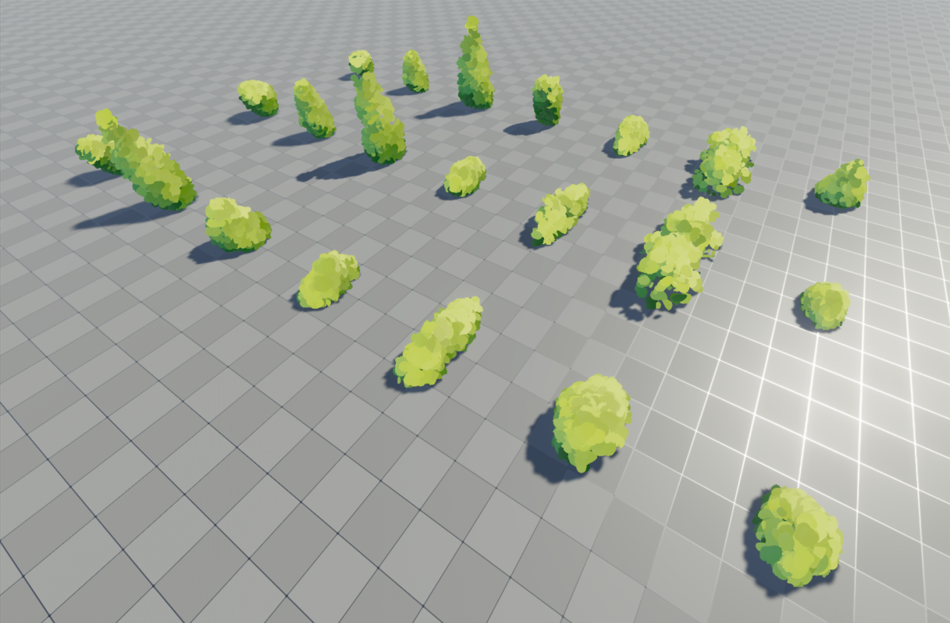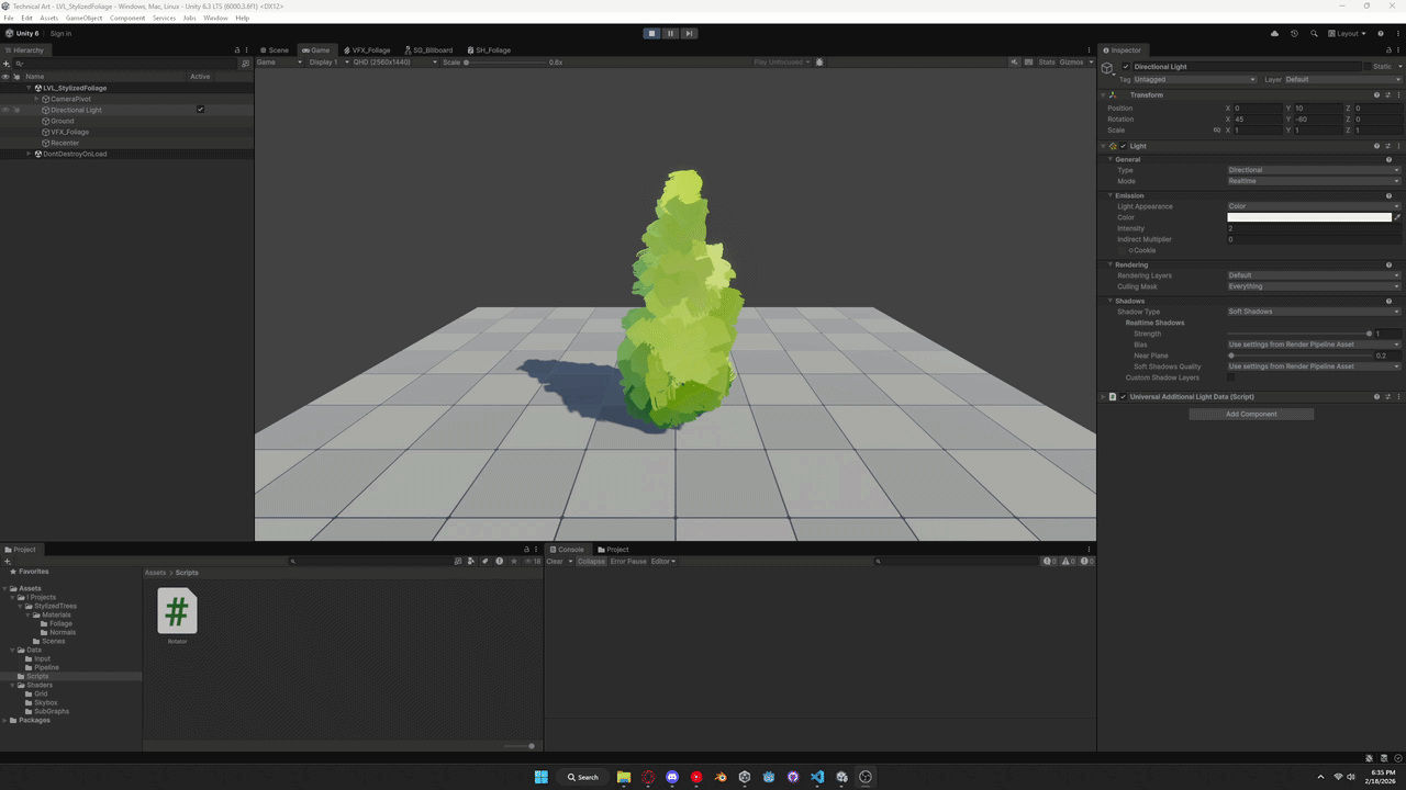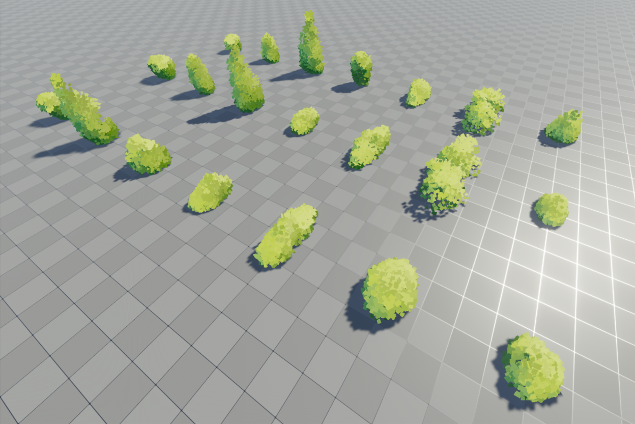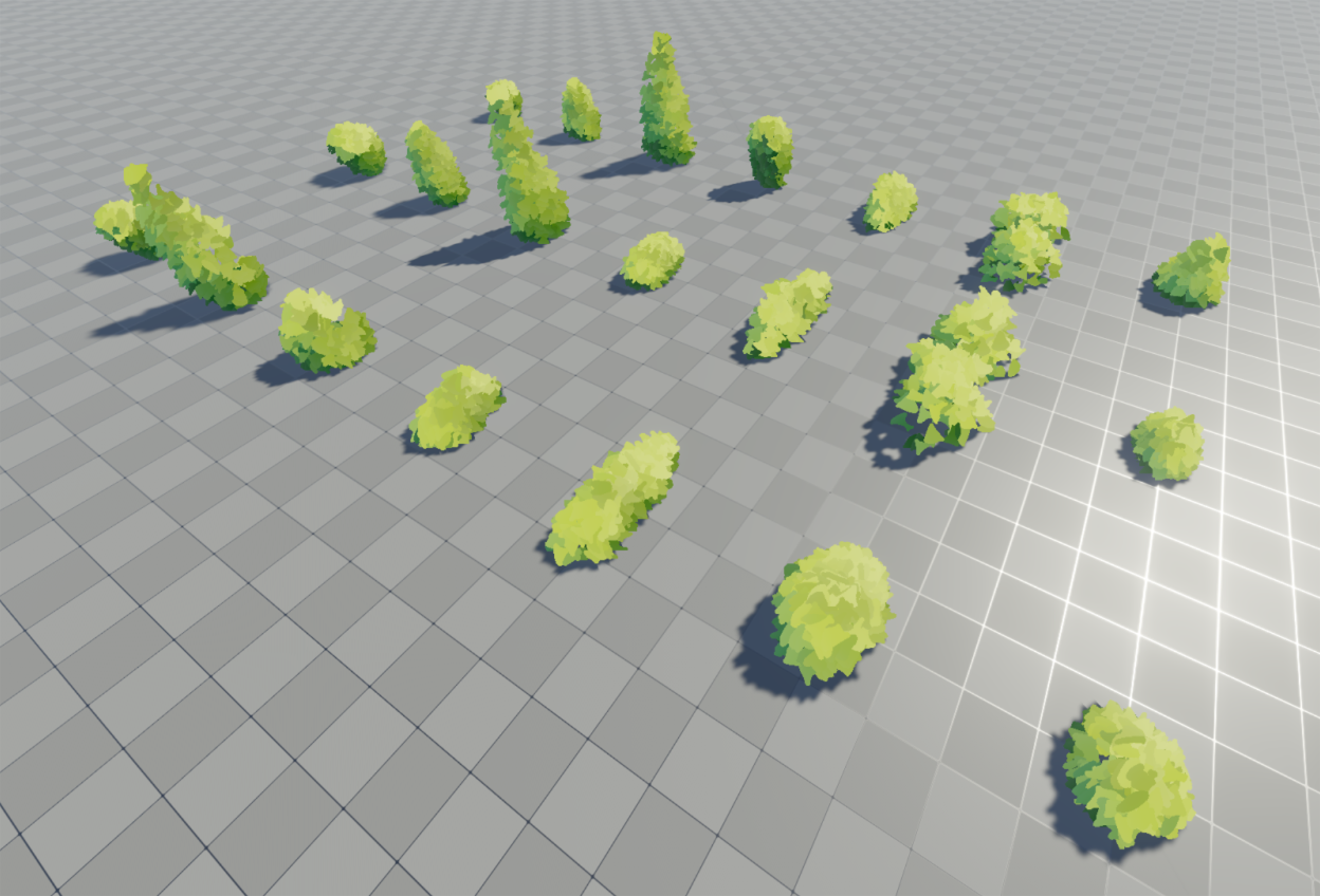 I use the VFX graph to sample a mesh and use it to procedurally place foliage cards. Cards are using a custom shader which shades it based on mesh normals, billboards towrds the camera, and has a vertex animation for wind.
